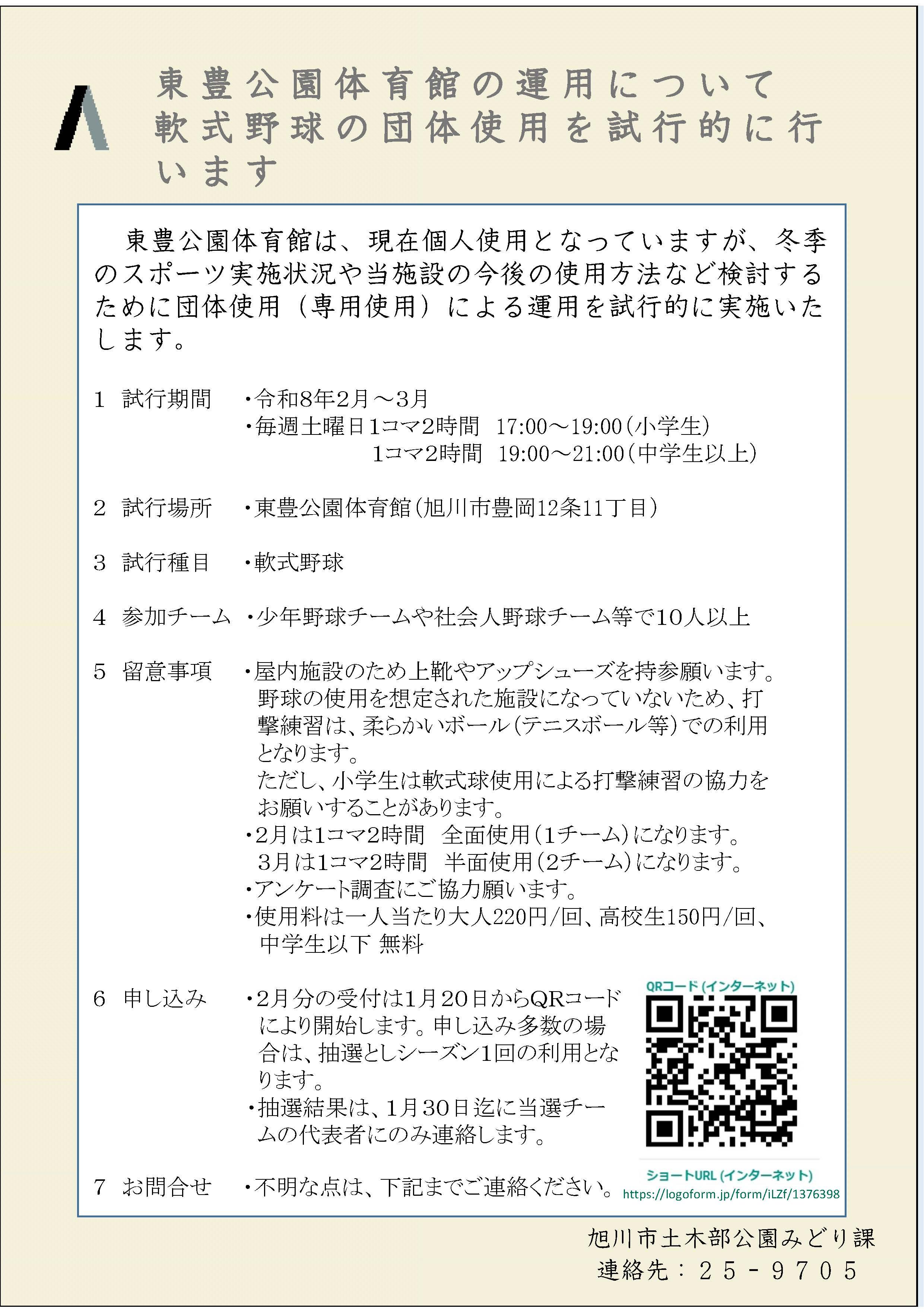 関連記事 旭川市のホームページ(東豊公園体育館の軟式野球団体使用の試行について)